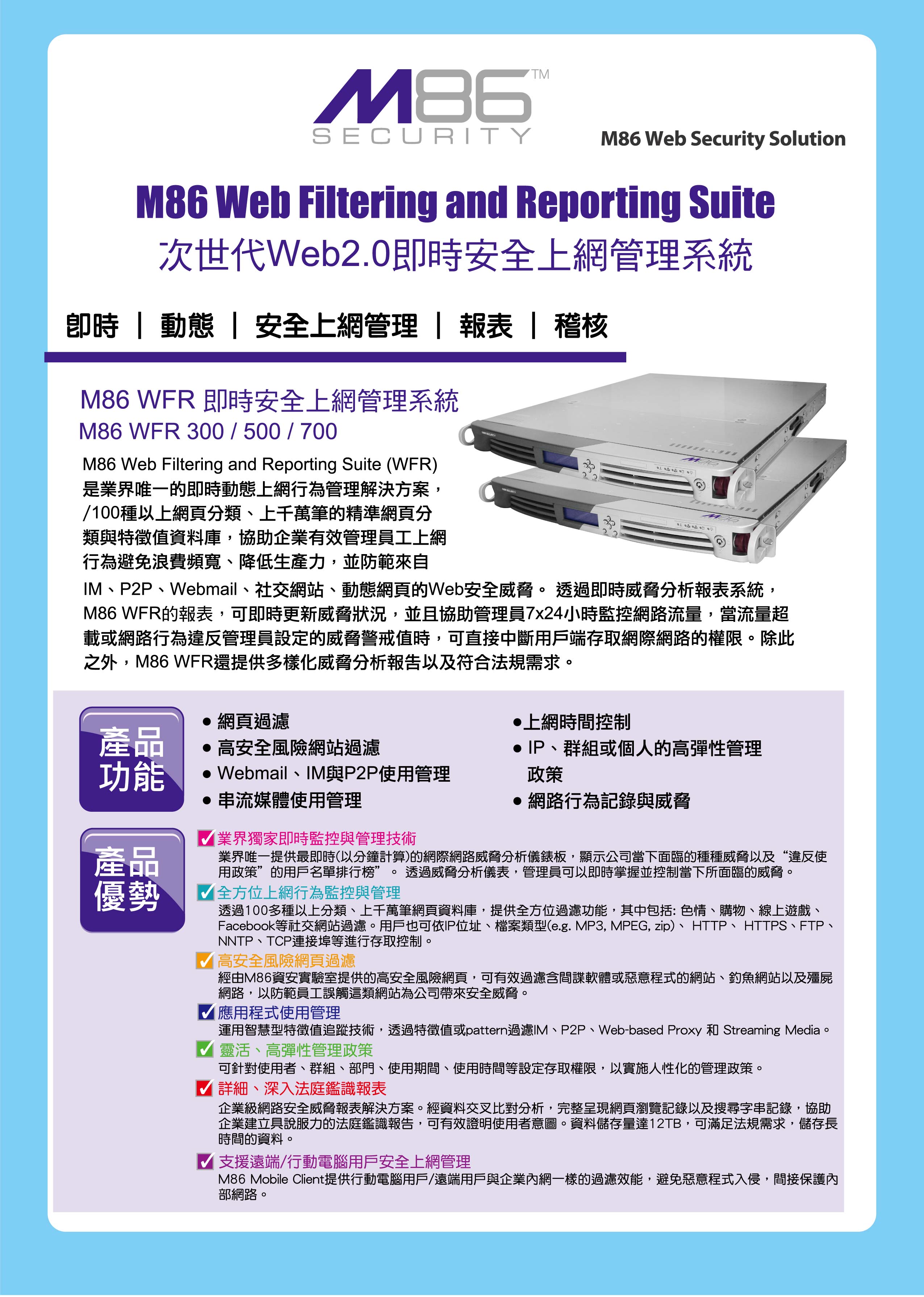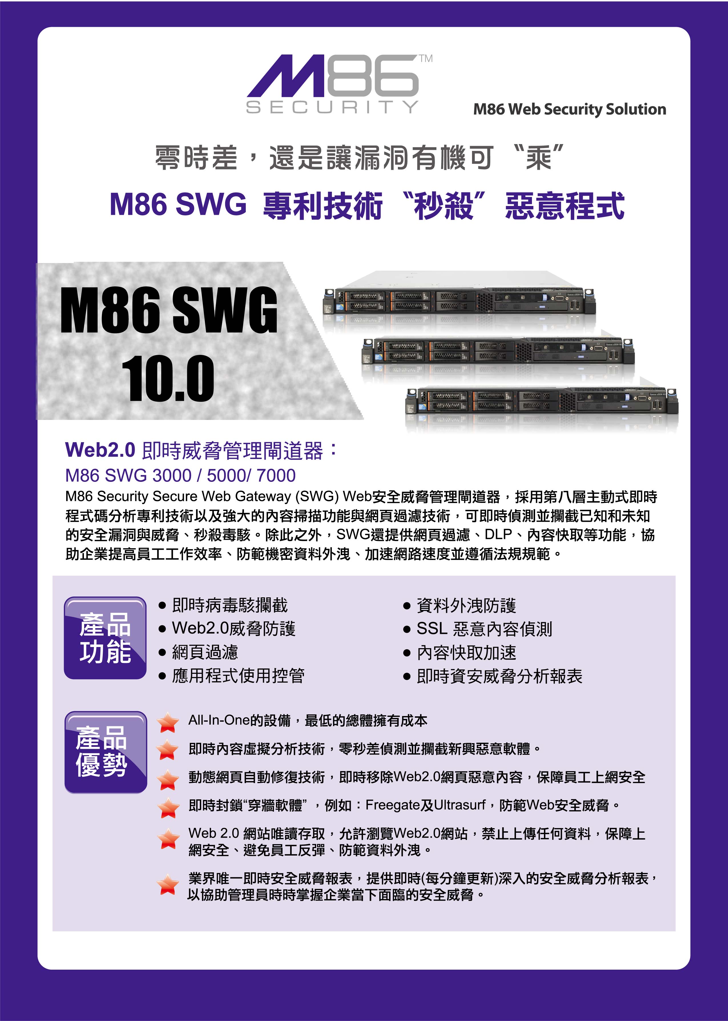 M86 Security 具有完整的安全產品系列,提供管理和保護電子郵件、網路及端點安全、防止資料外洩的必要工具。採用本公司的網路及電子郵件過濾解決方案後,客戶即可主動強制採行網路使用政策,遵循企業的要求,提升網路效能,同時保護員工不受內部惡意軟體的侵害。本產品容易管理、安裝以及整合至任何的網路環境。M86 Security致力於滿足大中小型企業、全球型企業、教育和政府機構的需求。